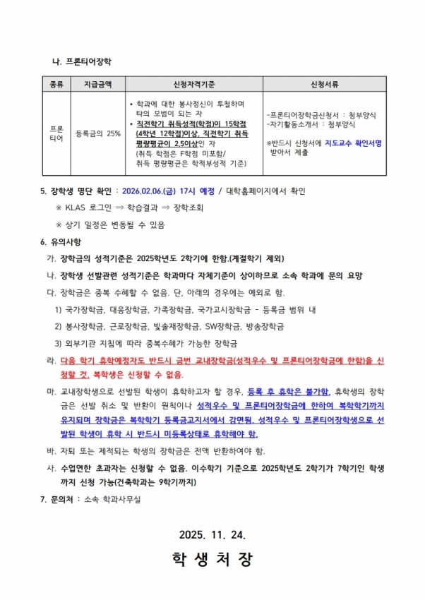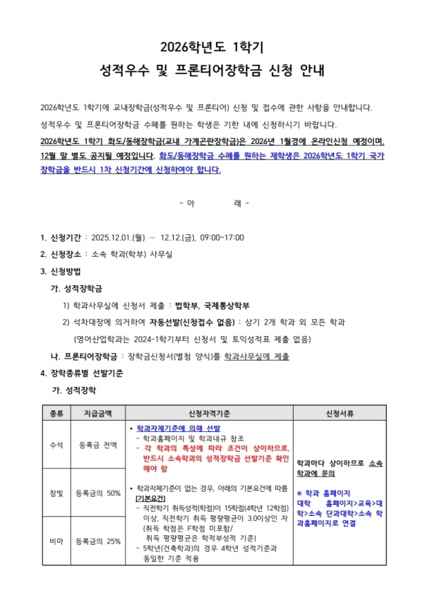 2026학년도 1학기 성적우수 및 프론티어장학금 신청 안내